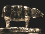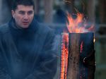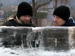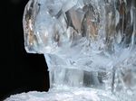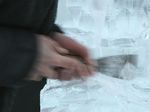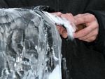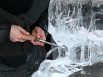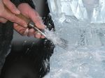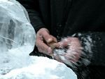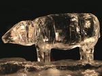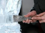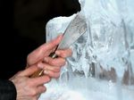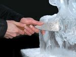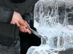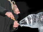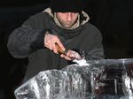 Der Eisbildhauer Stefan Geiger fertigt aus einem Klareisblock ein Heidenheimer Schaf